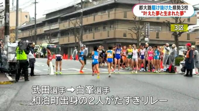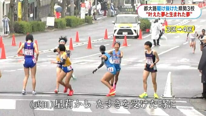 3区武田は、周りに留学生ランナーが走るスピード区間で、1年生ながら力走。幼馴染、白峯に繋ぎます。