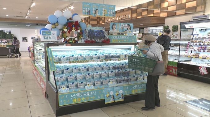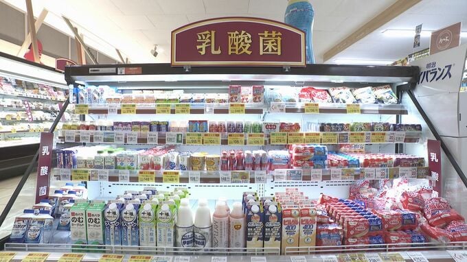 さまざまなメーカーの乳酸菌に関する商品が並びます。キリンビバレッジによると、「おいしい免疫ケア」シリーズのことしの11月末までの販売数は、前の年に比べ3割ほど伸びました。