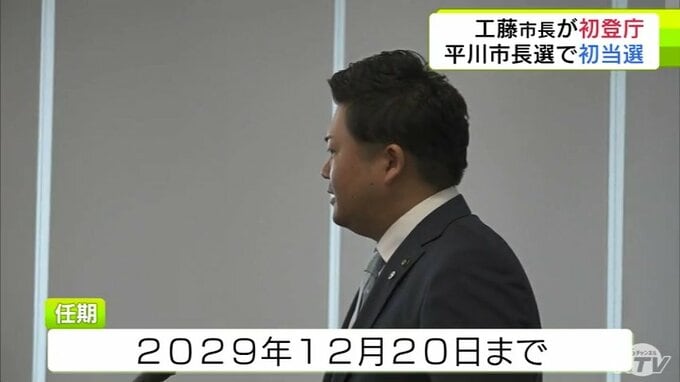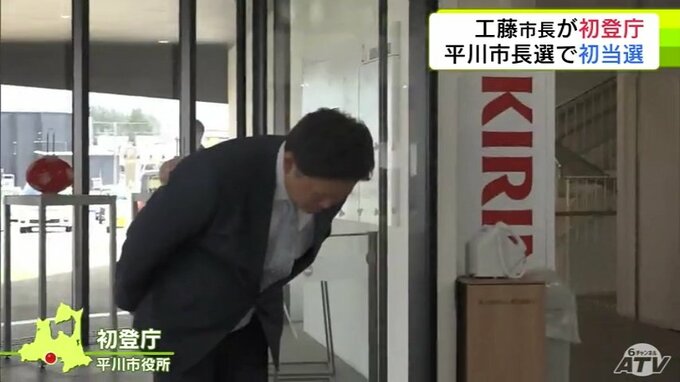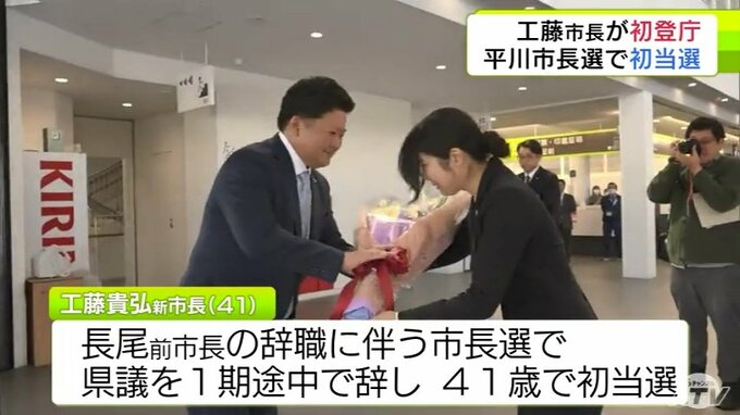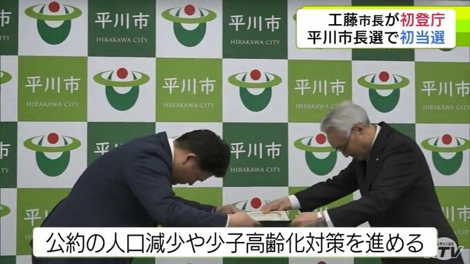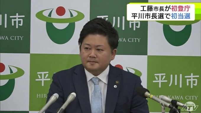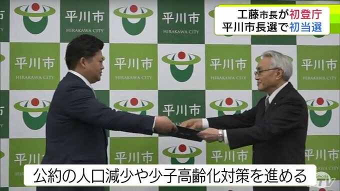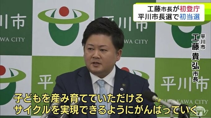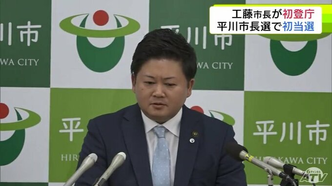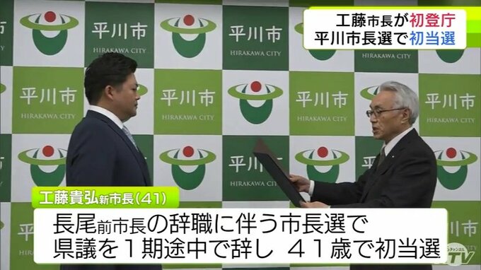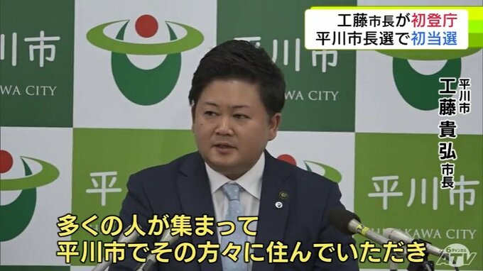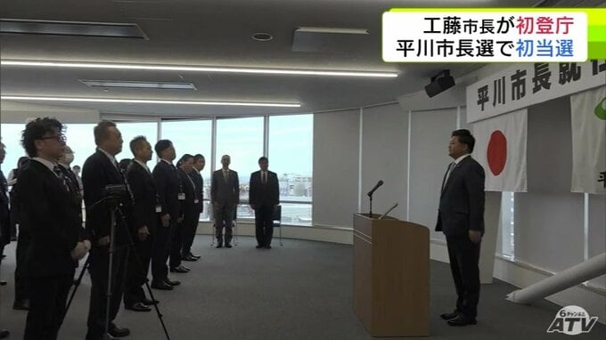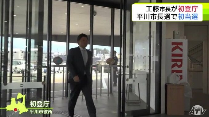 平川市長選挙で初当選の工藤貴弘 市長(41) 一夜明けて初登庁 青森県