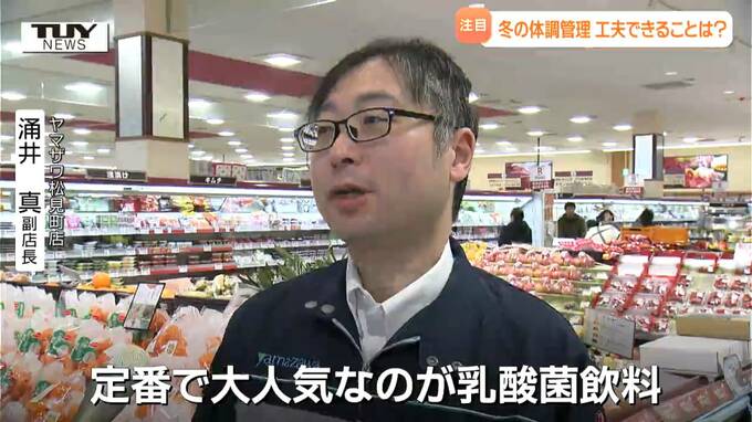 ヤマザワ松見町店 涌井真 副店長「定番で大人気なのが乳酸菌飲料。冬になると風邪やインフルエンザなどが流行るのでお客様の予防意識が高まっているのかなと思う」