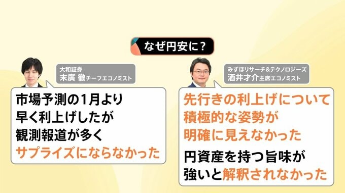 この理由について、大和証券の末廣徹チーフエコノミストは「市場予測の1月より早く利上げしたが、観測報道が多く、サプライズにならなかった」と指摘しています。