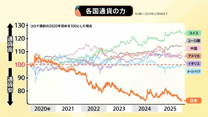 実際に、各国の通貨の力の推移を比べてみましょう。コロナ禍前の2020年初めを100とした場合に、スイスのフランの価値は上昇、ユーロ圏や中国、アメリカ、イギリス、オーストラリアは、ほぼ横ばいとなっています。