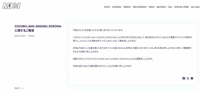続けて「このたび、COCORO、RAN、SHIZUKU、KOKONAは、2025年12月31日をもちまして、株式会社LAPONE GIRLSとの専属マネジメント契約を満了し、ME:Iとしての活動を終了いたしますことを、ご報告申し上げます。」と、記しました。