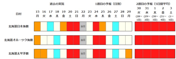 北海道地方の向こう3日間程度は寒気の影響が弱いため高い日が多く、か