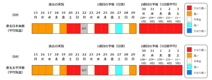 東北地方の向こう3日間程度は寒気の影響が弱いため高い日が多く、かな