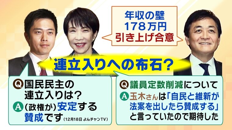 ―――維新がセンターピンとして打ち出していた議員定数削減について、吉村代表は「玉木さんは『自民と維新が法案を出したら賛成する』と言っていたので期待した」と、12月18日のよんチャンTV(MBSの番組)で発言しました。玉木代表はこの議員定数削減についてはどうお考えでしょうか?