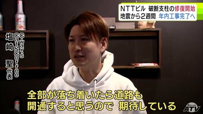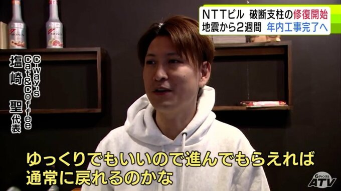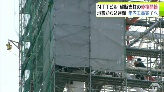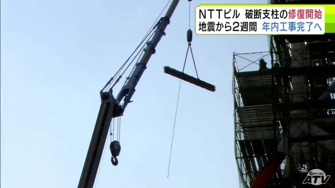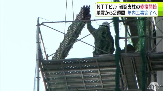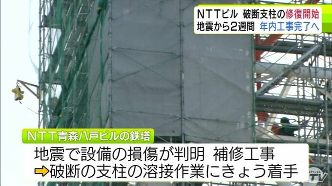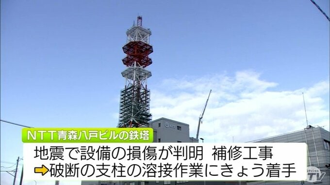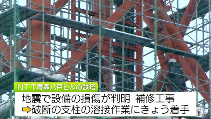 地震で損傷の「NTT青森八戸ビルの鉄塔」破断した支柱の補修工事はじまる 年内での工事完了目指す 青森・震度6強地震から2週間 八戸市