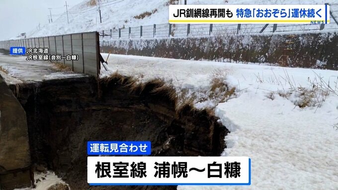 一方、同じく暴風雪の影響で線路の土台がえぐれた根室線の浦幌と白糠のあいだは運転見合わせが続いていて、「特急おおぞら」の一部が運休、帯広と釧路のあいだはバスによる代行輸送となっています。