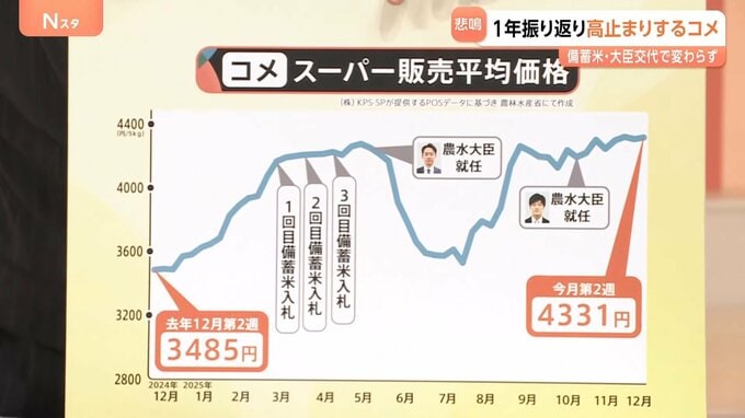 コメのスーパーの販売平均価格は、12月第2週で4331円となっています。1年前(2024年12月第2週)は3485円でした。
