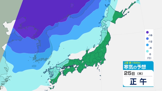 24日(水)は西日本を含め暖かな空気に覆われますが、25日(木)になると西から強い寒気が流れ込み、気温が急降下する見込みです。