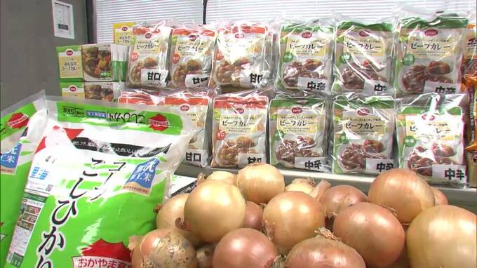 野菜やレトルト食品などの食料品がメッセージカードとともに寄贈されました。「おかやまコープ」が商品の販売代金から積み立てた基金を活用するもので、社会福祉協議会などを通じ県内約70か所の子ども食堂に贈ります。