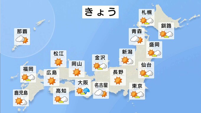 きょうの日中は広い範囲で冬晴れとなり、強い北風はおさまる見通しです。西日本は寒さが和らぎますが、関東から北日本はこの時季らしい寒さが続くでしょう。ただ、夜は近畿や東海などで、雨の降り出す所がありそう…