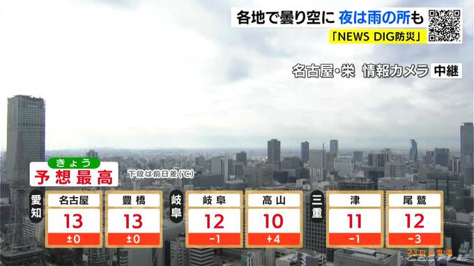 最高気温は名古屋や豊橋で13℃、岐阜や尾鷲で12℃、高山で10℃くらいになるでしょう。日差しは少ないものの、きのうよりも風の冷たさは和らぎそうです。