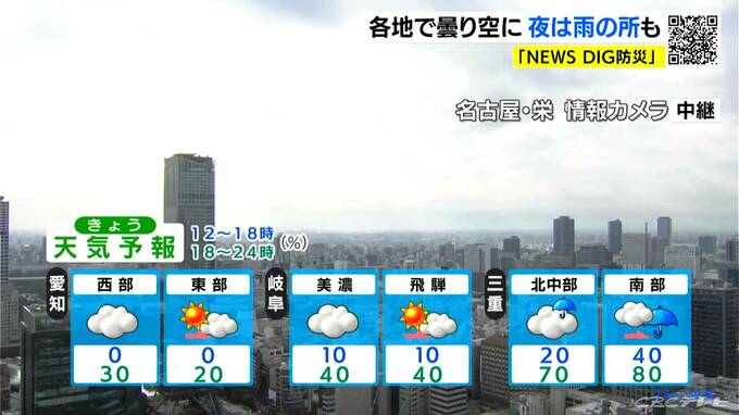 きょうはこの時間に日差しが届いている所も次第に雲が多くなるでしょう。夜は三重県南部から雨雲が広がり、愛知県や岐阜県でも所々で雨が降りだす見込みです。