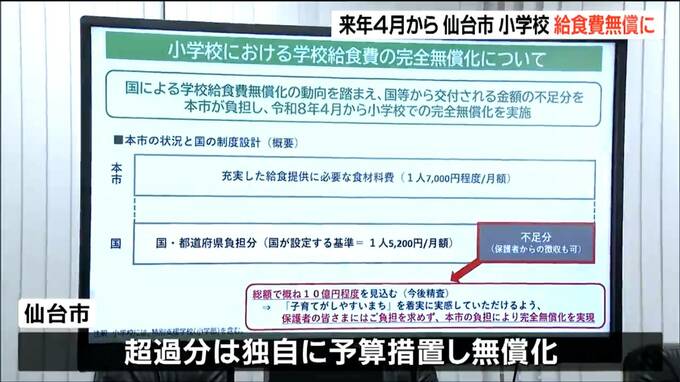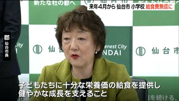 仙台市は2026年4月から市立小学校の給食費を無償化すると明らかにしました。国の交付金のほか市の独自財源で賄います。