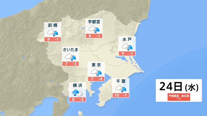 24日(水)の東京の予想最高気温は、きょうより4℃低い7℃の予想です。
