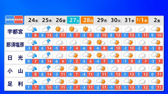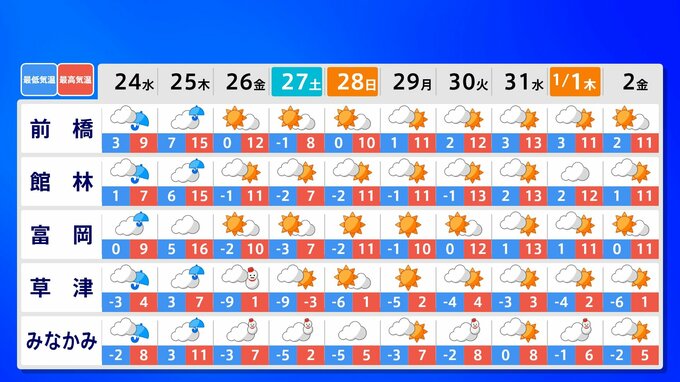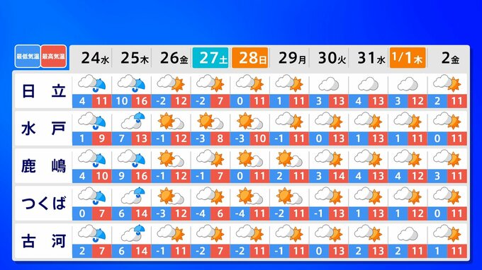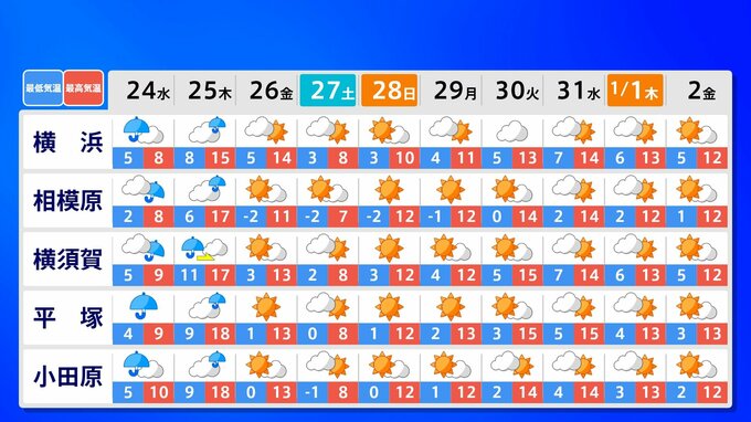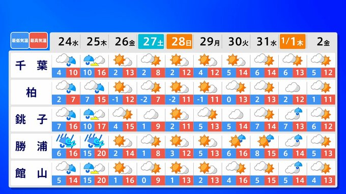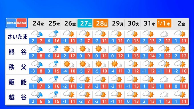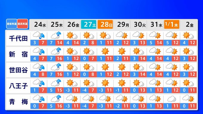 【東京首都圏 あす雪か?】クリスマスイブは「雪」「冷たい雨」凍てつく寒さに【雪と雨のシミュレーション24日(水)~25日(木)/ 関東各都市の10日間予報(1月2日まで)】東京・神奈川・埼玉・千葉・群馬・茨城・栃木 南日本放送 2025年12月23日(火) 12:00 国内 天気 関東地方 各都市の週間予報(24日(水)~1月2日(金)) 各都県につき5か所ずつ掲載しています。東京の場合、千代田区・新宿区・世田谷区・八王子市・青梅市です。 関東地方の元日(祝)は「くもりときどき晴れ」の予報が多くなっています。