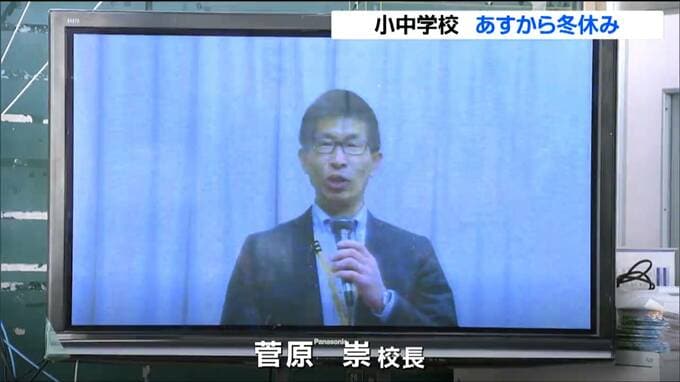 2025年最後の朝礼は、感染症や寒さ対策のためリモートで行われ、菅原崇校長が「交通ルールを守り目標をたてて元気に冬休みを過ごしてほしい」と呼びかけました。児童たちはその後、冬休み中の目標を考え、それぞれ期待を膨らませていました。
