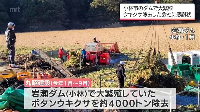 宮崎県小林市のダムで大繁殖した特定外来生物のウキクサを除去した都城市の建設会社に県から感謝状が贈られました。感謝状が贈られたのは、都城市の丸昭建設です。丸昭建設は、小林市の岩瀬ダムで大繁殖していた特…