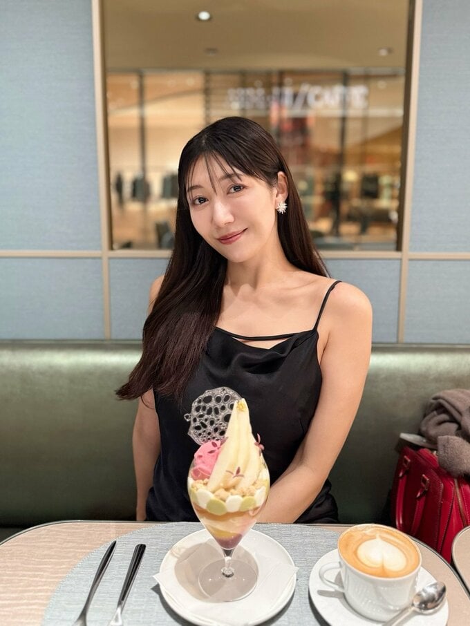黒いキャミソールのワンピースを着た穂川さんは、パフェについて「洋梨とラズベリーシャーベットとピスタチオの組み合わせが最高に美味しかったの」と綴っています。