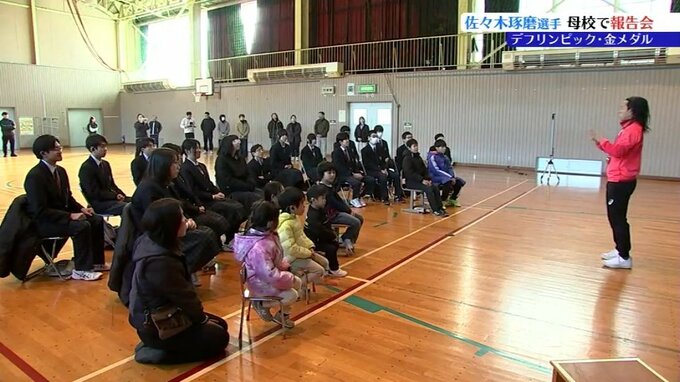 聴覚に障害がある人たちの国際スポーツ大会デフリンピックで二つのメダルを獲得した佐々木琢磨選手が23日、母校の盛岡聴覚支援学校を訪れ報告会を行いました。