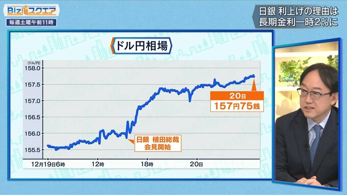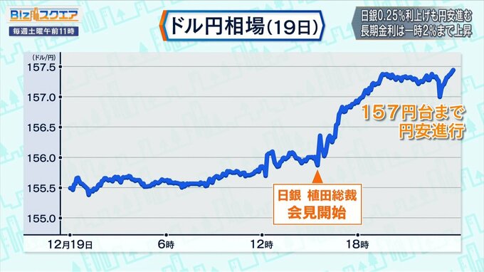 しかし、植田総裁の会見中、為替は1ドル156円台と1円ほど円安方向に。さらにその後、海外の市場では157円台まで円安が進み、期待されていた円安の解消にはつながらなかった。