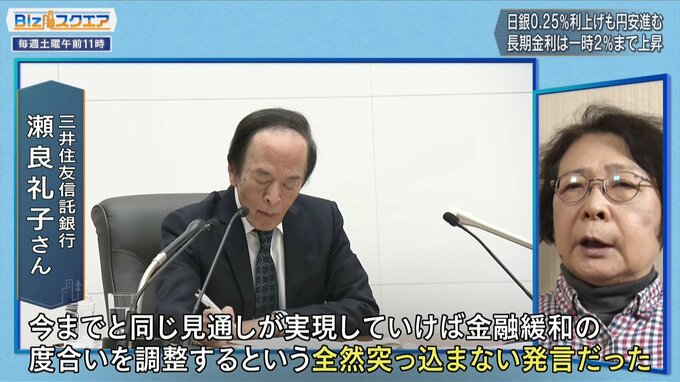 番組の為替予想でおなじみの瀬良礼子さんは、「こんなに円安に動くとは正直思わなかった」とする一方で、要因は植田総裁の会見にあると話す。