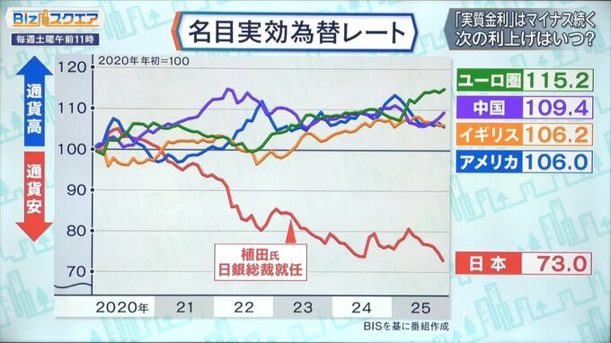 複数の国の通貨に対する自国通貨の総合的な価値を示す【名目実効為替レート】では、主要通貨の中で円だけが突出して弱い。