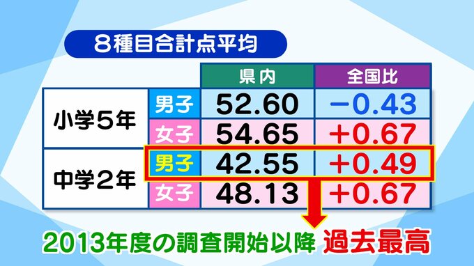 県内の8種目の合計点の平均は、小学5年男子は全国平均を下回りましたが、小学5年女子と中学2年の男女はそれぞれ全国平均を上回りました。なかでも中学2年男子は42.55点で、調査を開始した2013年度以降、過去最高となりました。