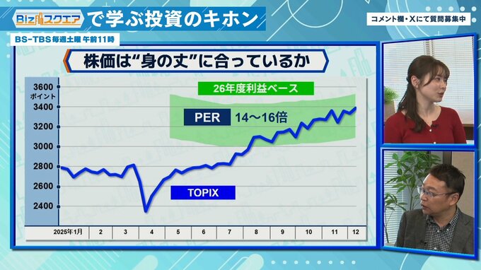 「25年7月下旬ぐらい、関税合意辺りからガンガン上がってきているが、12月で3400ポイントぐらいでまだ標準レンジの中。企業の業績に対して株価が何倍になっているかという指標のPER(※標準は14~16倍)でいうと、15.4倍辺りで少し上値余地もある感じ。もちろん26年度の12~13%の増益が本物かどうかのリスクは残っているが、それを前提にすれば別に高すぎることはない」