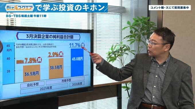 「中間決算が終わった段階で、2026年度は純利益ベースで11.7%増が見込まれている。市場ではそれよりちょっと上ぐらいを既に織り込んでいるということ。そうは言ってもちょっと高すぎでは?と思うかもしれないが、バブルっていうほどでもない」