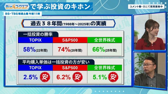 「積立投資よりも1月一括投資の方が安く買えた・リターンが高かったという“勝率”でみると、S&P500や全世界株式で7割ぐらい。購入単価も一括の方が5~6%安く買えた。TOPIXはちょっと勝率が下がって単価の割安さも若干薄れるが、日本株は38年間にバブル崩壊の時期を含んでいる。株価が下がっていく時は積立投資の方が有利なので、日本株はちょっと分が悪い。ただ日本株もバブルの清算は終えたから、今後はS&P500、全世界株式と近い状態をイメージしておけばいいと思う」
