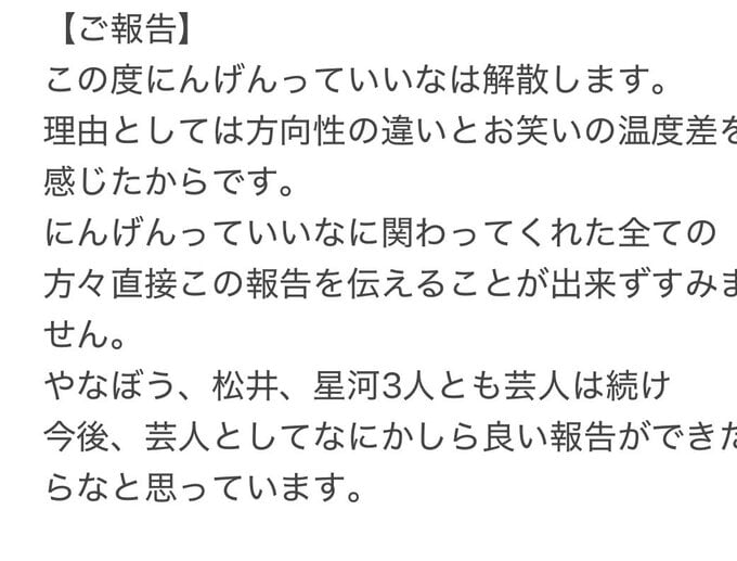 星河さんは解散の理由について、「この度にんげんっていいなは解散します。理由としては方向性の違いとお笑いの温度差を感じたからです。」と投稿。