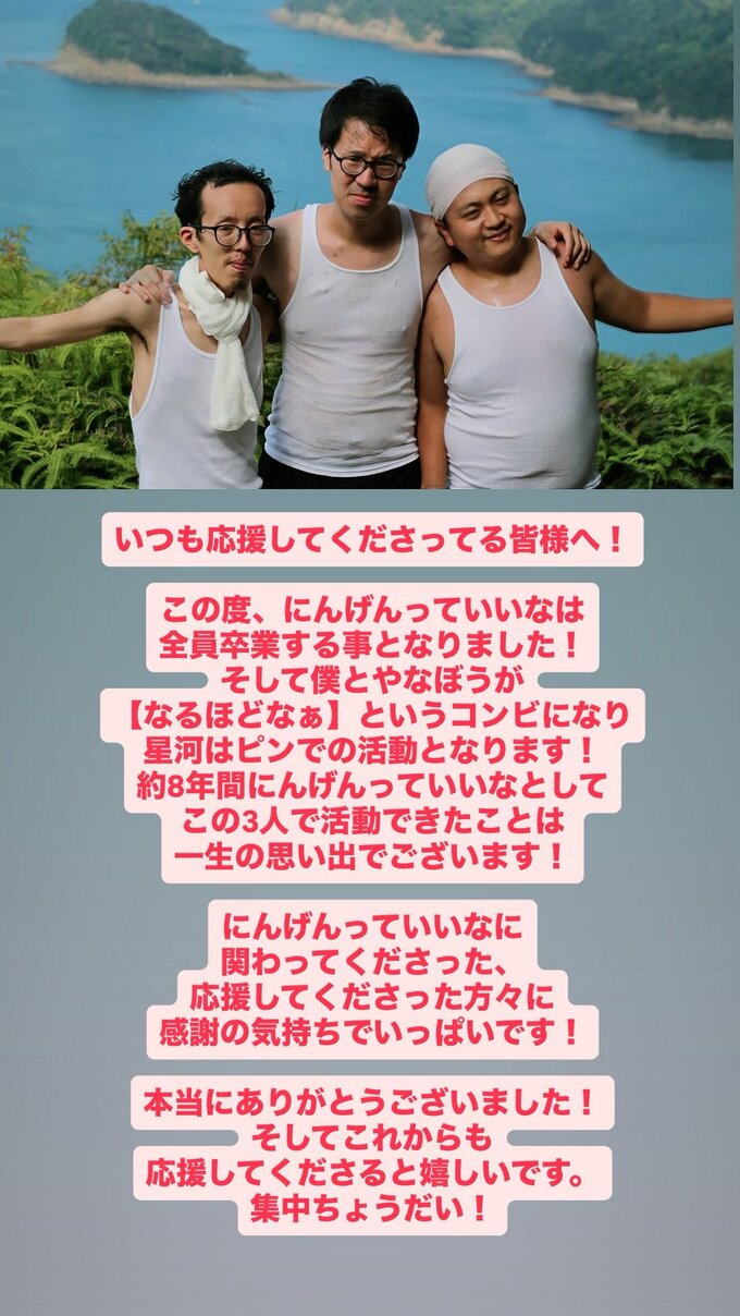 松井正平さんは3人の今後について「僕とやなぼうが 【なるほどなぁ】 というコンビになり星河はピンでの活動となります!」と報告しています。