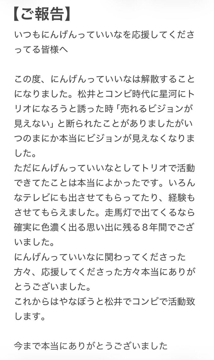 松井正平さんも「約8年間にんげんっていいなとしてこの3人で活動できたことは一生の思い出でございます!」と綴っています。