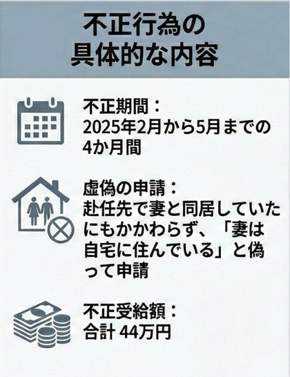 県によりますと、係長は2025年2月から5月まで、単身赴任先で妻と同居していたにもかかわらず、妻は自宅に住んでいると偽り、単身赴任手当と住居手当あわせて44万円を不正に受給していたということです。