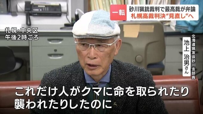 北海道猟友会・砂川支部長の池上治男さんは2018年8月、砂川市の要請を受けてヒグマを駆除しましたが、発砲した際、住宅に銃弾が届くおそれがあったとして北海道公安委員会に猟銃所持の許可を取り消されました。