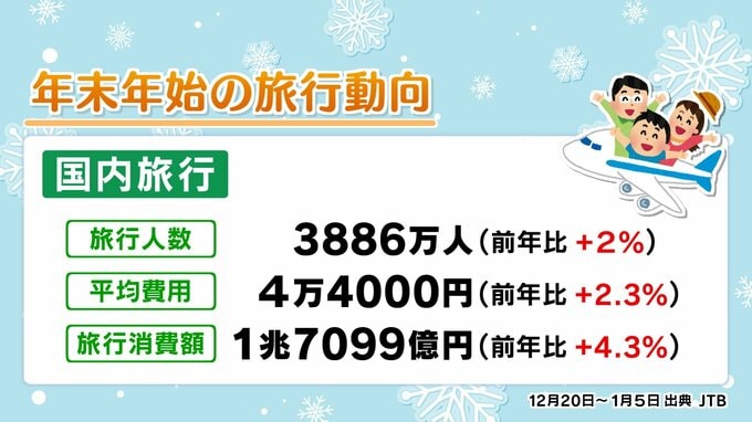 大手旅行代理店JTBがまとめた年末年始の旅行動向によりますと、国内旅行でみると、旅行人数は3886万人で前の年より2.5%増加、平均費用は4万4000円と物価高騰の影響などを受けて2.3%増えました。旅行消費額は1兆7099億円で前の年より4.3%増えると推計されています。