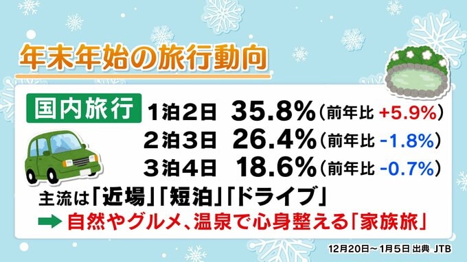 最多は「1泊2日」最大9連休の年末年始、主流は「近場」「短泊」「ドライブ」 テレビユー福島 2025年12月24日(水) 06:00 国内 最多は「1泊2日」 旅行の日数は「1泊2日」が最も多く、主流は「近場」「短泊」「ドライブ」です。マイカーで行ける場所での自然やグルメ、温泉で心身を整える「家族旅」が多くなりそうだということです。