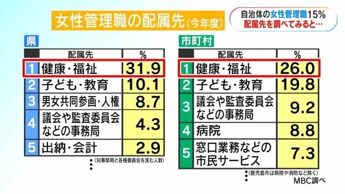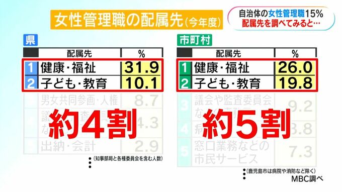 一方、時間外勤務が多いといわれる総務・財政・企画などいわゆる「官房系」の部署で働く女性管理職は、今年度は霧島市の財政課長などがいましたが、女性管理職全体に占める割合は、市町村平均でわずか4.6%。県では本庁にはいませんでした。