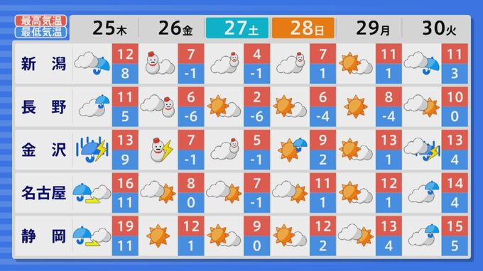 金沢の最低気温は-1度と、平年より3度あまり低い予想です。クリスマスの少し暖かさを感じる気温から一変しそうです。