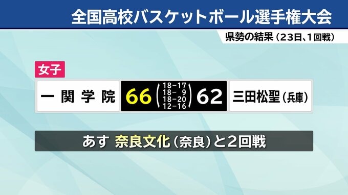 23日に初戦へ臨んだ女子の一関学院は、兵庫県代表の三田松聖との接戦を制して、66対62で勝利しました。24日は2回戦で奈良県代表の奈良文化と対戦します。