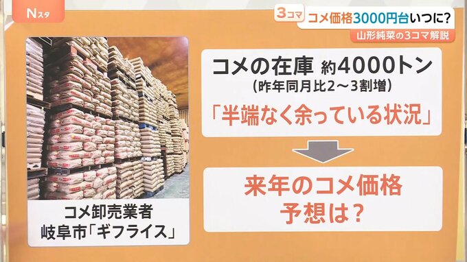 岐阜市のコメ卸売業者「ギフライス」によると、コメの在庫は約4000トンで、2024年の同じ月に比べて2~3割多い状況で、「半端なく余っている状況」だということです。