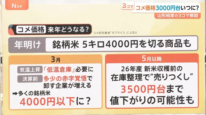 また、5月以降は2026年産の新米収穫前の在庫整理の時期で、“売りつくし”のため、3500円台まで値下がりの可能性もあると予想されています。