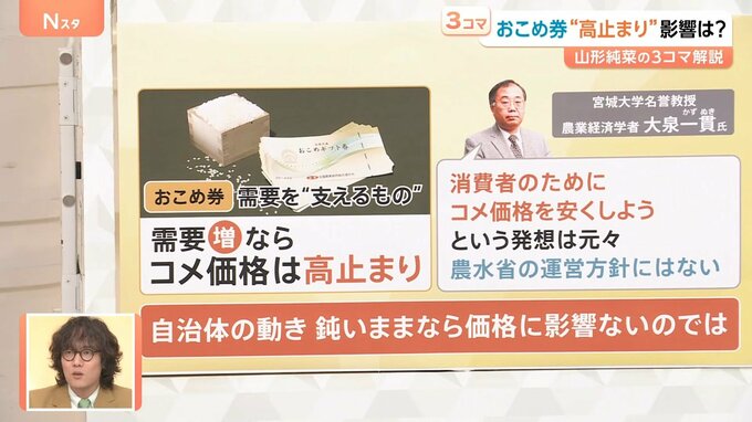 宮城大学名誉教授・農業経済学者の大泉一貫さんは、おこめ券は“需要を支えるもの”としていて、コメの需要が増えれば、コメ価格は高止まりするのではないかということです。