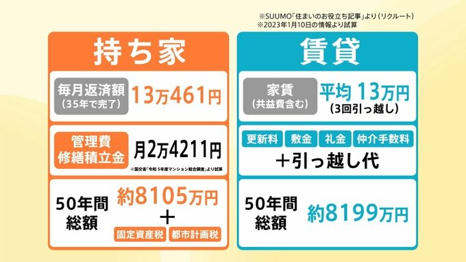 →50年間総額:約8105万円+固定資産税、都市計画税