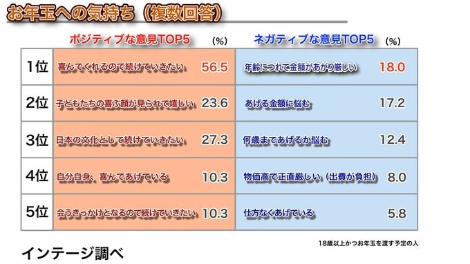 また、あげる人のお年玉に関する意見は、全体的にポジティブな意見が多く、「喜んでくれるので続けていきたい」56.5%でトップ。一方、ネガティブな意見では「年齢に連れて金額が上がり厳しい」、「あげる金に悩む」などの悩みがある面もうかがえたということです。