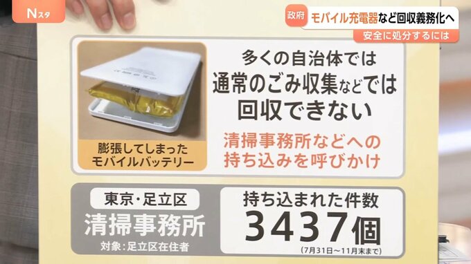 また、膨張・破裂してしまったモバイルバッテリーは、多くの自治体では、通常のごみ収集などでは回収できません。各自治体の清掃事務所などに直接持ち込むよう呼びかけられています。