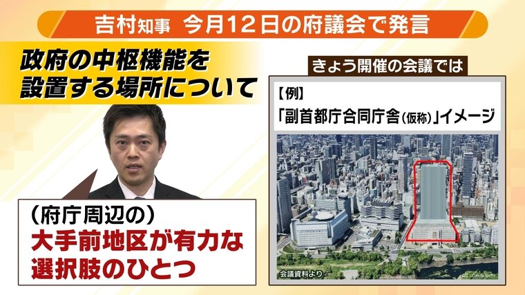 吉村知事は、政府の中枢機能を設置する場所について、12日の大阪府議会で「大手前地区が有力な選択肢の一つ」と発言。このエリアに「副首都庁合同庁舎(仮称)」を整備したい考えです。