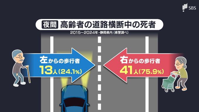 県警によると、過去10年間に起きた夜間の高齢者死亡事故では、右から横断した歩行者の死亡事故が、左からの場合に比べて約3倍多いという結果が出ています。